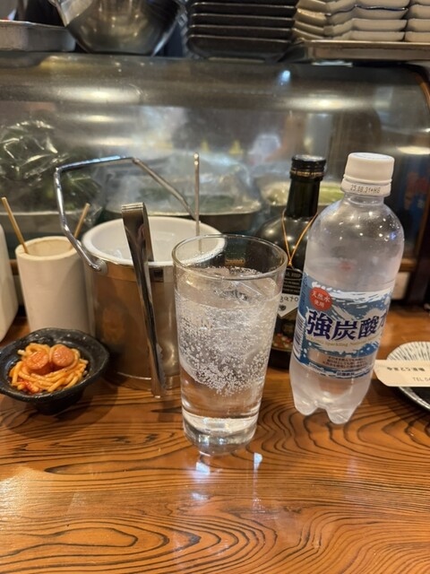 焼き鳥5串ととりたたきともつ煮をあてに焼酎の炭酸割りをいただきました