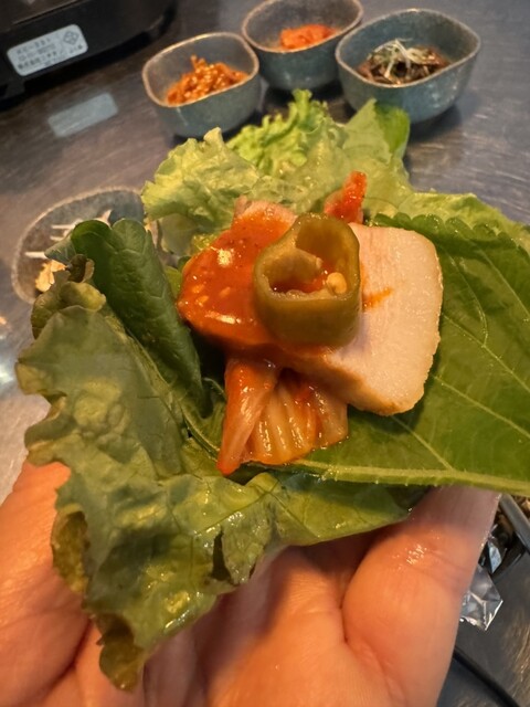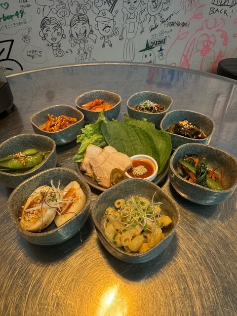 パンチャン(おばんざい)セット、名物蒸し豚、チュクミポックムホイル焼き、タッカンマリ、韓国式チュモッパをいただきました。