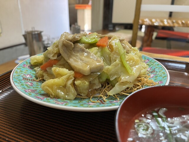 油通しされた歯応えの残るキャベツと三枚肉の皿うどん◎
