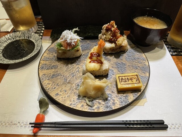 小さなおむすびの上に揚げたてサクサクの天ぷらが乗っているタイプです。お好みで天むすをお茶漬けにも出来ます♪小さめなので足りない方は追加料金をお支払いして天むす頼めますよ!お味噌汁も美味しいかったです。サラダ、デザート、飲み物もセットでついていて、この金額はとても嬉しいです。
