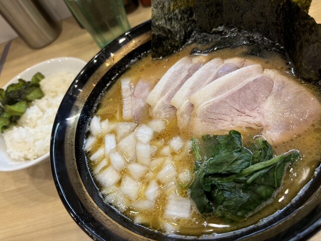 チャーシュー麺(肩ロース)に玉ねぎトッピング、ライス(中)を注文。