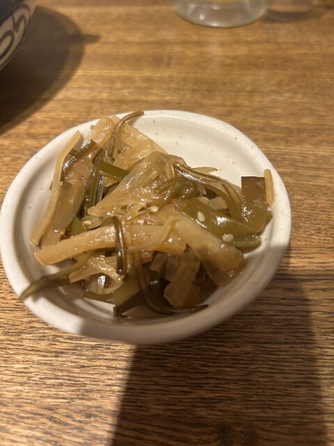 写真は、お通しの昆布や根菜が入った和風の小鉢。優しい味でスタートにぴったりでした。