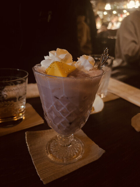クリスマスにふらりと立ち寄ったバー。初めてでも入りやすく、オリジナルカクテルのメニューが全て映画のタイトルなのがお洒落。「ナイトメア・ビフォア・クリスマス」は雪に見立てたクリームの上にぶどうが乗っていて、紫色のフルーティなカクテル。2杯目はチャーリーとチョコレート工場の続編の「ウォンカとチョコレート工場のはじまり」。星のチョコレートとクリームで、甘々のカクテルでした。カクテルが出てくるまでのドキドキ感。どれも視覚から楽しめて、美味しいです。ごちそうさまでした。また行きたい。