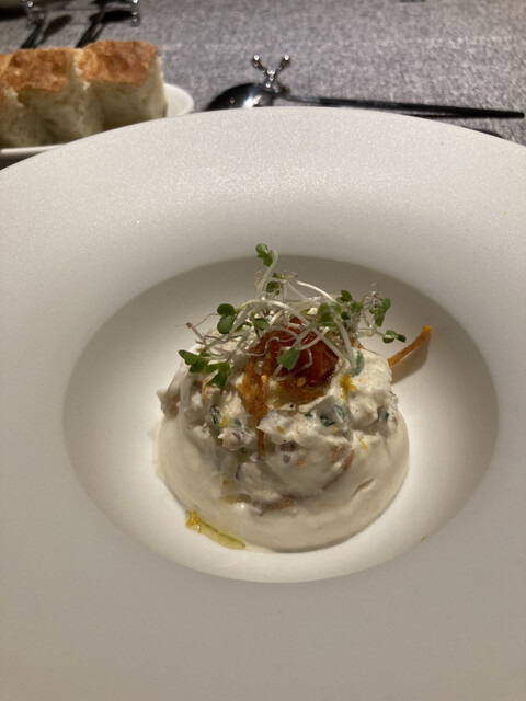 古民家を改修した宿で事前予約する事でお食事可能です。お料理は色々チョイスがあるようですが、本日はスペイン滞在経験のあるシェフによる地中海料理のフルコースを頂きました。