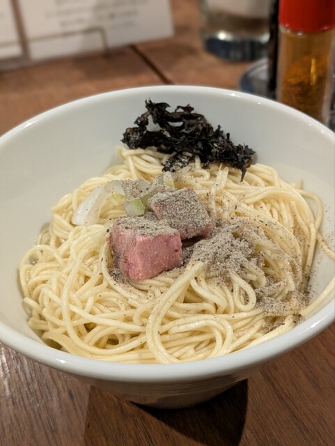 着丼し、すぐに感じるのは、シンプルで奥行きのある味わいのあるスープ。旨い。麺を口に運ぶ前に、何度も何度もスープだけを味わう。