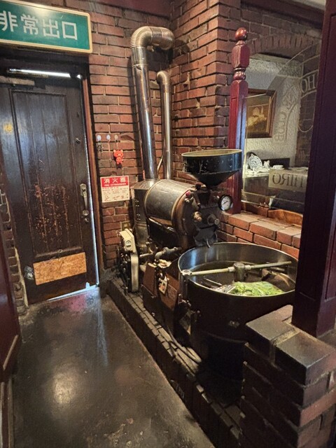 創業40年以上の老舗らしい、重厚なレンガ壁とクラシックなソファ席や椅子(写真あり)が配された店内は、非常に落ち着ける雰囲気。コーヒーへの強いこだわりを感じさせる、大きな焙煎機が店の片隅に鎮座しているのも、本店ならではの魅力です。アンティーク調の飾り棚には美しいカップが並び、随所に「コーヒーと文化」を大切にする心意気が感じられました。