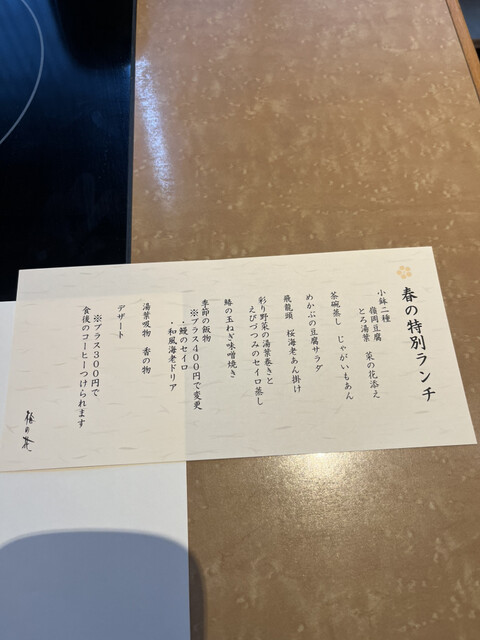 お店の雰囲気は落ち着いていて席から素敵な庭園を眺める事が出来ます。春の特別ランチを頂きました。お店の方が料理を運んでくるたび見た目の美しさで感動、食べてさらに感動と大変大満足でした。お腹がいっぱいになったのに豆腐料理のせいか全然胃が重くなくまた機会があれば絶対行きたいです。