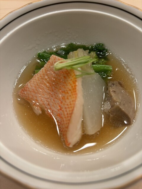脂の乗ったキンキ・カブ・キンキの肝を蒸してから優しいお出汁で炊いたお品