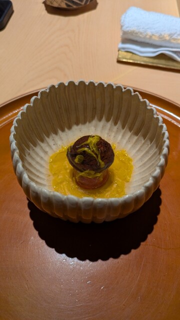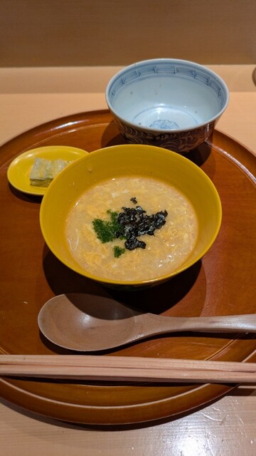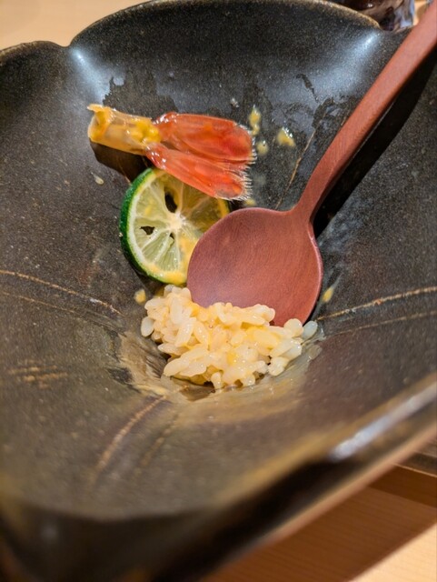 八寸からはフォアグラ最中(満寿泉との相性が最高笑)、雑煮、酸味の効いた三宝柑を挟んで、唐墨餅のお粥が登場しましたが、これは今まで食べた中で一番美味しい唐墨だった!