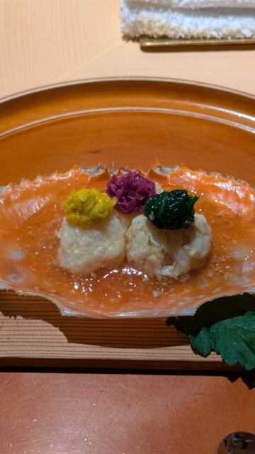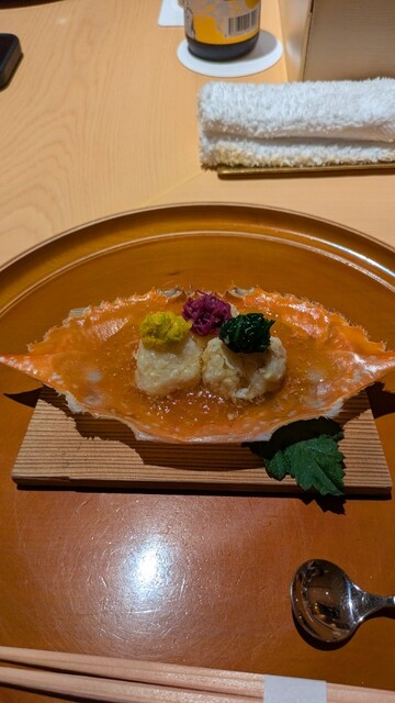 唐墨餅とお粥の相性に驚きながら、追加の焼き蟹が調理される様子をのんびり眺めていましたが、そこから八種類の具を使いながらもパラりと解ける見事な締め方の太巻、鼈出汁と虎河豚の白子の椀と豪華絢爛なメニューが続きました。