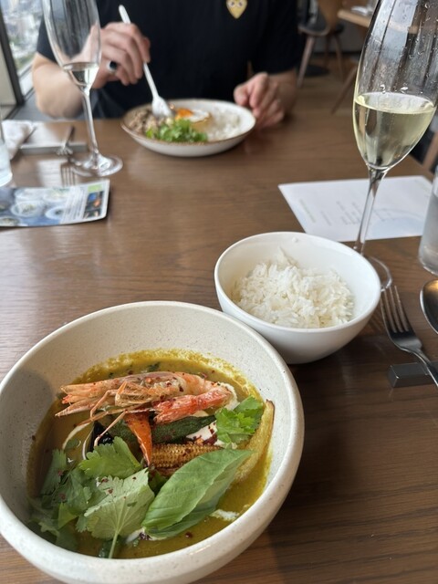 グリーンカレーは、一般的な“ココナッツミルクで伸ばした濃厚タイプ”というよりも、スパイスや野菜を丁寧にミキサーして仕上げたような奥行きのある味わい。具材の焼き加減も絶妙で、家庭では再現できない本格派でした。