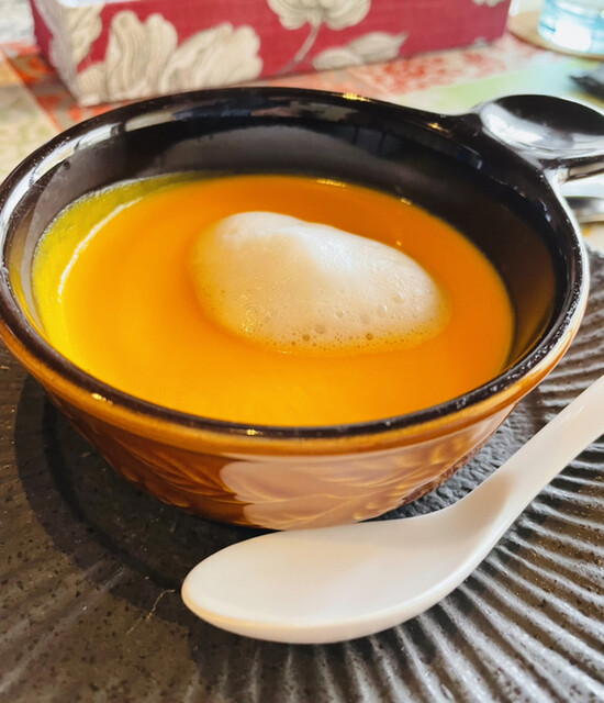 ニンジンのポタージュはすごく濃厚でフォーミー&クリーミー。熱々でめちゃうま。人参嫌いの親びんも飲めちゃいました!