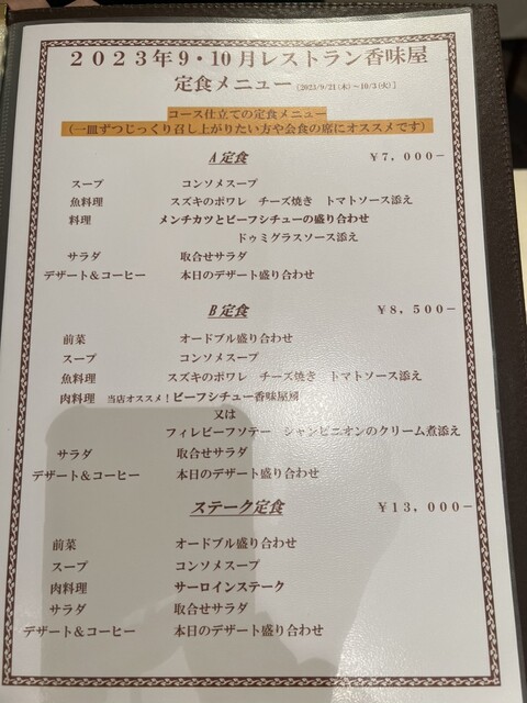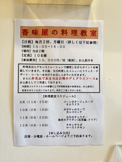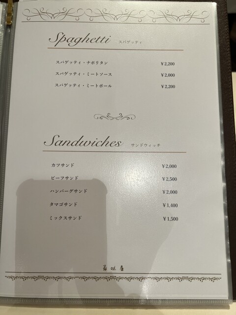お目当てのナポリタンを初オーダー、お一人様でキョロキョロしていたら「お暇でしたらお読みください」と味の手帖をスッと差し出された。きっとお子様には店頭にあるミッケを渡されるのでしょう。パスタなので10分程で提供されかけたが、駐車場の移動依頼が重なり、ナポリタンは厨房に戻り、私は駐車場へ(ワンちゃんみたいに一芸するまで待てだ)無事に車移動してお預けだったナポリタンに再会。目が悪くて気がついてなかったけど、海老のナポリタンだ!海老好きには嬉しい。しかもブラックタイガーだからぷりぷりで美味しい。パスタはちょっと細めだ海老と合う。美味しくてフォークが止まらず結構な量を一気に食べてしまった。