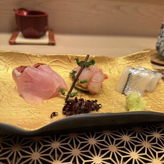 握り (コハダ・車エビ・煮ハマグリ)と小鉢