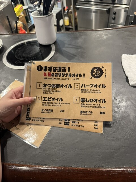 アヒージョ専門店ってどんなものなんだろ?と思っていて、好きなオイルを1つ選んでから、好きなアヒージョの具材を選び、自分でアヒージョの中に入れていくスタイル。