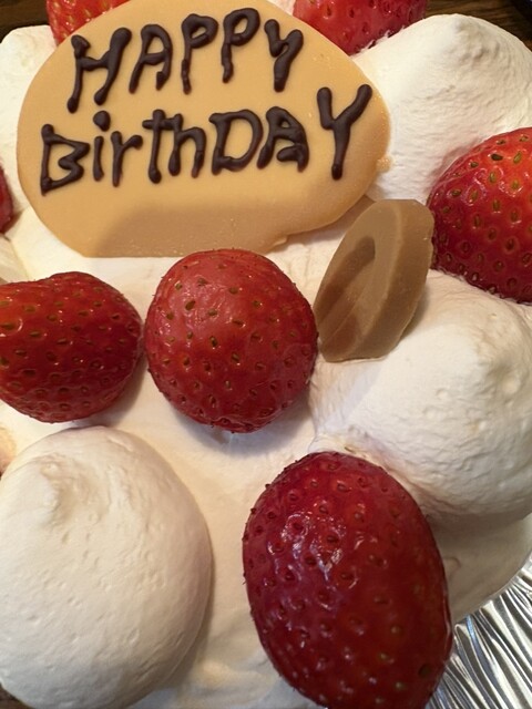 お誕生日に、定番いちごの生クリームのホールケーキを購入しました。リピーターです!こちらのロールケーキやバームクーヘンも大好きです!隠れた名店?として地元にケーキの美味しいお店があって幸せ〜いちごのホールケーキは、とにかくスポンジも生クリームも食べ心地はもちろん後味も軽やかでさっぱり!くどい甘さも全く無く、15号ってちょっと大き過ぎたかななんて思ったけど、4分の1ペロリと食べられそう‥今回は食べる時間が夜遅かったので一応控えめに8分の1.5位にしておきました笑ハッピーバースデーのプレートも手作り。文字も長いのは書けないと言われたけれどそれも良しって感じです。プレートは美味しいモカまたはミルクティーのような香りのチョコレートでこれだけでも美味しい!ついでに??同じ素材の謎の小判のようなのチョコが載ってました!これも美味しくいただきました。