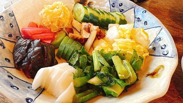 前菜の野菜料理、そばがき、蕎麦のおじや、お蕎麦、お漬物、蕎麦団子のおぜんざい