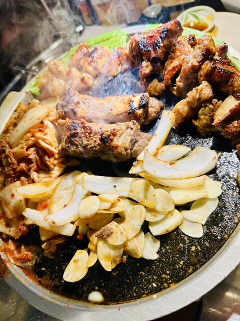 なしやりんごの特製たれにつけこんだ大きな豚のアバラ肉をサムギョプサル用の傾斜のついた鉄板で店員さんが美味しく焼いてくれます