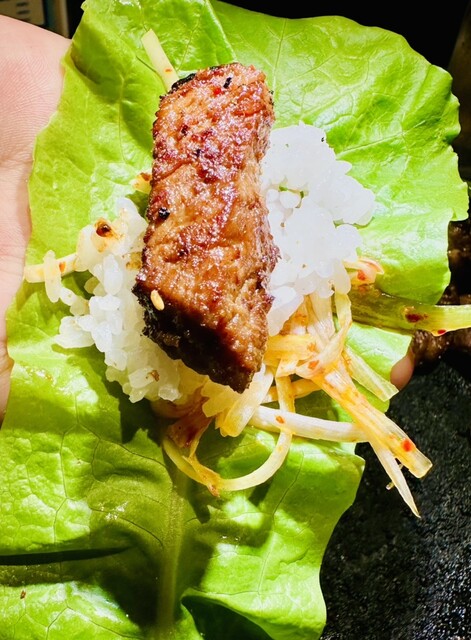 いい感じに焼けたお肉はごま油につけてサンチュにエゴマ葉、白髪ネギやキムチやガーリックなどを自分の好きな様に乗せて野菜たっぷりで食べるよ〜