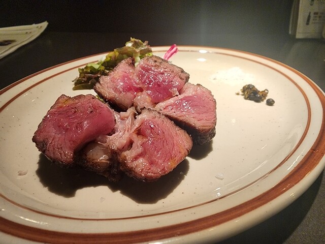 自分は熟成肉より普通の肉の方が好きなので、これを狙ってこのお店に来ました。断面は美しく、いぶされたような焼き目の風味が素晴らしいです。中はしっとりで、とても柔らかくナイフも入る。でも表面は強火でカリッと風味良く炙られていて、手が止まりません。