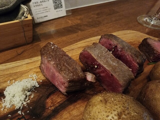 個人的に気になったのは、ステーキの両サイドを切り落としていたこと。これって、あえて焼き目を落として、断面から酸化させているのでしょうか?