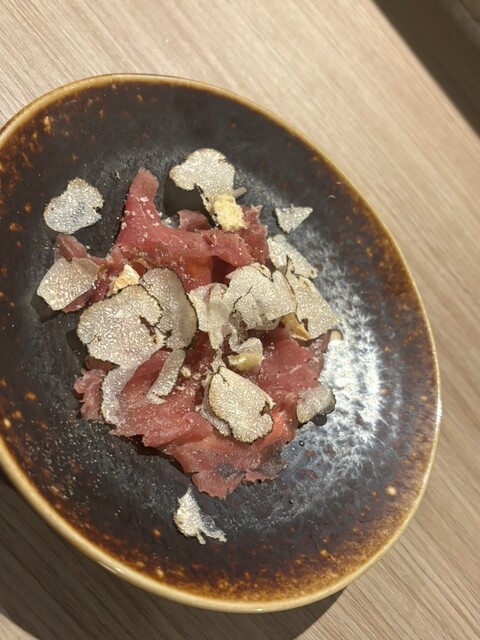 ・牛もも肉の極薄スライスとジャガイモのクレマ、サマートリュフがけ