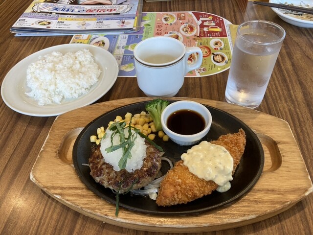 おろしハンバーグ&白身魚フライランチ、ライス、ランチスープ、お冷