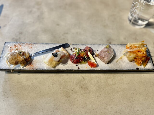 …色とりどりの前菜が美しい!左からポテトサラダ、キャビア乗せつぶ貝のバゲット、まぐろのマリネ、パテドカンパーニュ、洋風南蛮漬けです。