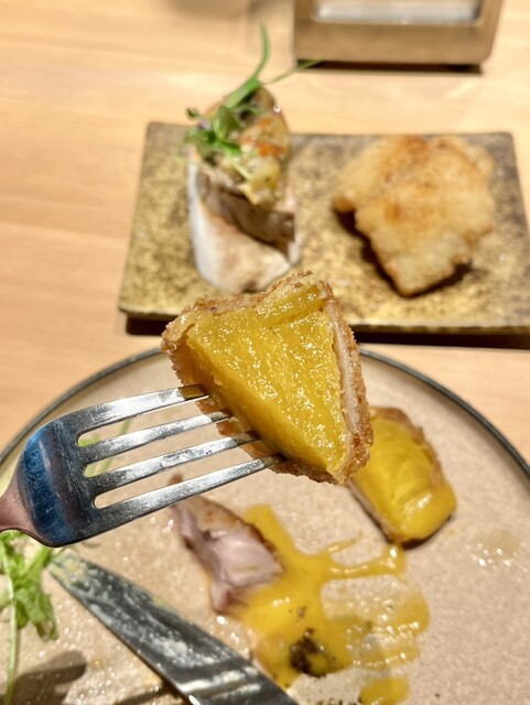大和肉鶏のグリルに添えられたのは柿のソルベ。アツアツの鶏にひんやりしたソルベをソースのようにつけて頂くのはオシャレすぎますね。更にまさかの柿フライはここでしか味わえない独創性爆発の一品がお見事!
