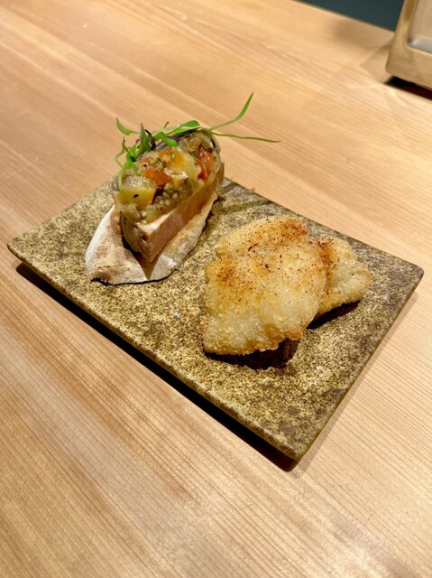 …シャインマスカットとピーマンの組み合わせが斬新すぎる!なのに意外とマッチする味わいはさすがイノベーティブ。のっけからミシュランの技を見せつけられます。