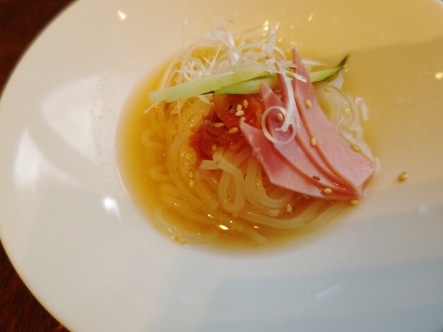 前菜は、松前漬けやカニ、アスパラと、北海道らしい食材がちょっとずつ楽しめた。