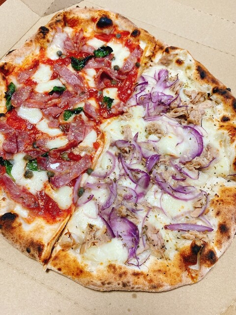 食べログ イタリアン TOKYO 百名店に選ばれているお店。テイクアウトでピザを注文しました。ハーフ&ハーフにしました。正確な名前忘れましたが、冷めても美味しいし、温め直してトロッとしたチーズがまた美味しい。生地が薄めなので一人で一枚はペロリと食べてしまいそうでした。今度は2枚注文しないと足りないです!お店でピザやパスタも食べたいです!