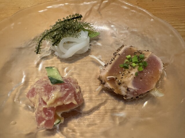 上まぐろ・カンパチ・トビウオ・イナダのなめろう・ソデイカ、まぐろ中トロ・サワラ・太刀魚・白子汁=3993円