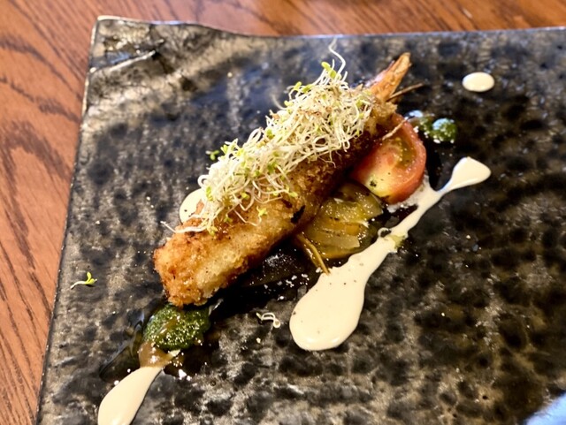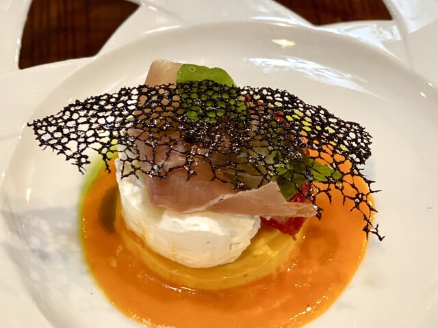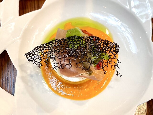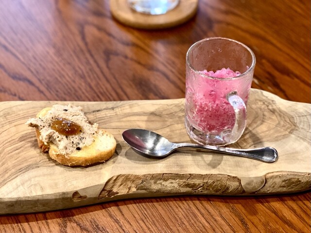 店内はゆったりと落ち着いた雰囲気です。お料理のほうは言うまでもなく美味しく、最初に登場したアミューズからしてやられました。名前をメモしていませんが、赤紫蘇の風味のするかき氷は、爽やかな和の風味で、猛暑を忘れる清涼感でした。