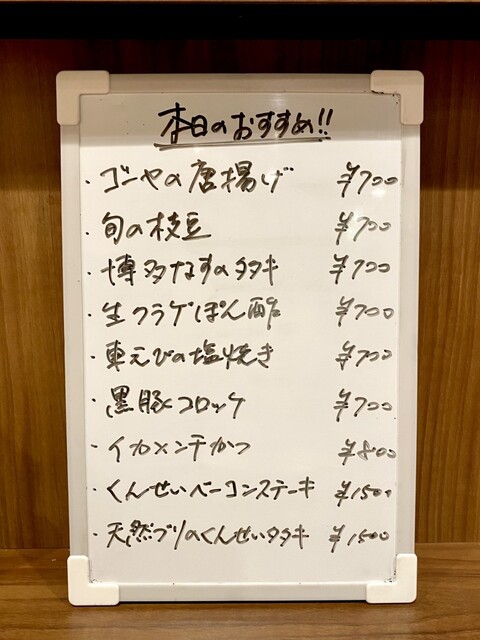 フードメニューを開く前に、卓上に置かれた「本日のおすすめ!!」が目に入りました(写真)。目移りしつつしばらく眺めた後、「博多なすのタタキ」と「黒豚コロッケ」を注文。「黒豚コロッケ」は通常は1皿2個だそうですが、親切にもお店の方が「1個にできますよ」と教えて下さったので、1個にしていただきました。