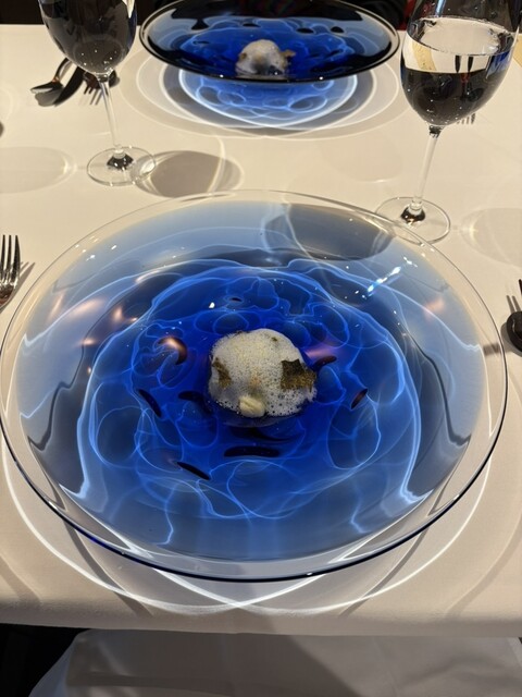青の洞窟の前菜はお皿が海のよう、まるで本当に青の洞窟の色、行ったことはありませんが(╹◡╹)