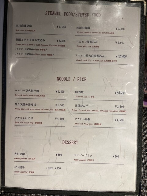 前菜4種、ふかひれ入り蒸しスープ、天津2種、揚げ物2種、酢豚、麻婆豆腐、XO 炒飯、本日のデザート、おかし