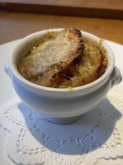 あっちあちのできたてオニオングラタンスープはジビエ(鹿)のお出汁を使ったものらしく(珍しい)ほんのりワイルドな風味。玉ねぎとじゅわっとお出汁が染み込んだフランスパンでボリューム感たっぷり
