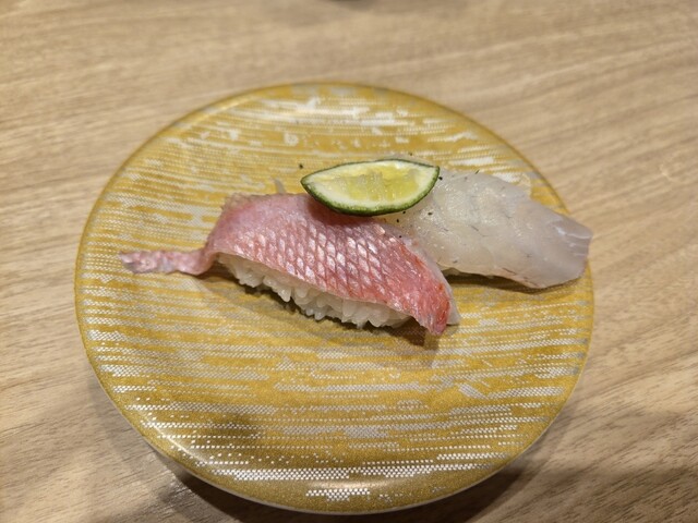 鮮魚三貫握り(タイ、ハマチ、ヒラマサ) 407円、特選アジ 産地直送 308円