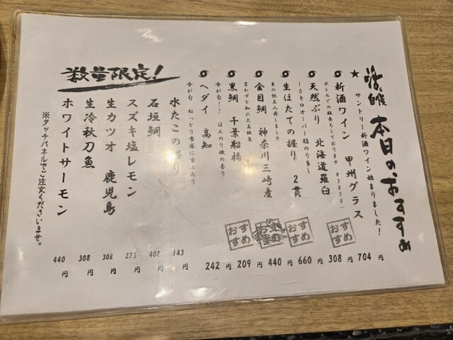 天然ぶり 北海道羅臼 308円、金目鯛 神奈川三崎産 440円
