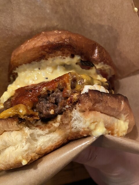 具材をいっぺんに口に入れることは諦め、まずはパテをガブリ!肉汁が溢れます。