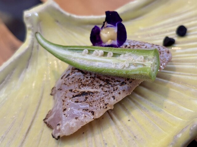 ハマチ・豚・カサゴの前菜三品は季節や海をイメージしたというシェフ作製の器で提供