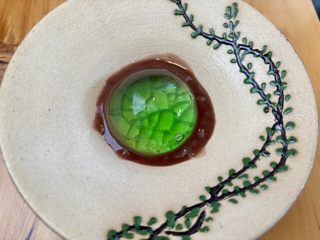 リゾットはハーブと松阪鳥むね肉に空芯菜とジャガイモで中は夏・外は秋と季節の変わり目を表す器