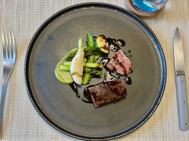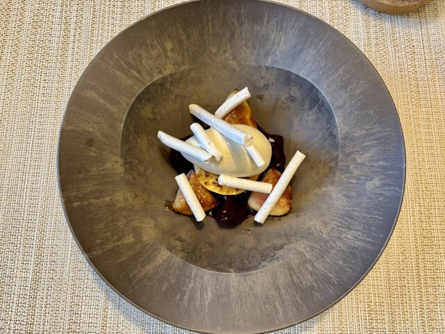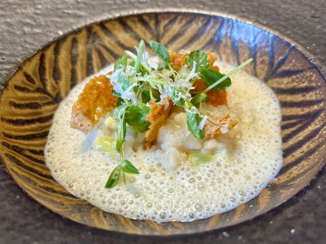 キャベツのソース仕立ての枝豆のリゾットをはさみ本日のお魚料理が運ばれてきた