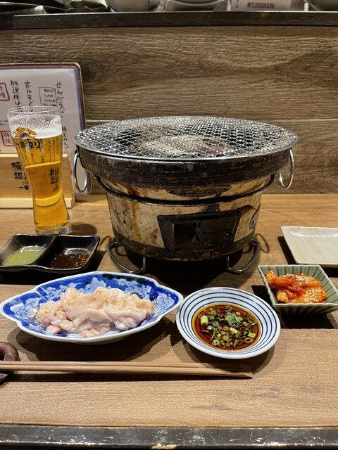 七輪で自分のペースで焼いて食べる塩ホルモンがいいお酒のお供に