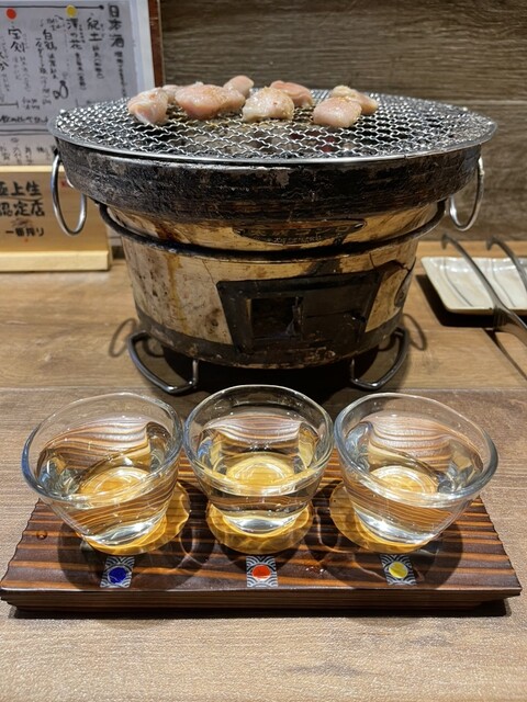 日本酒3種飲み比べがあり七輪でちょびちょびガツ、白レバーを焼きながらたべる幸せな時間をすごせました