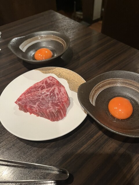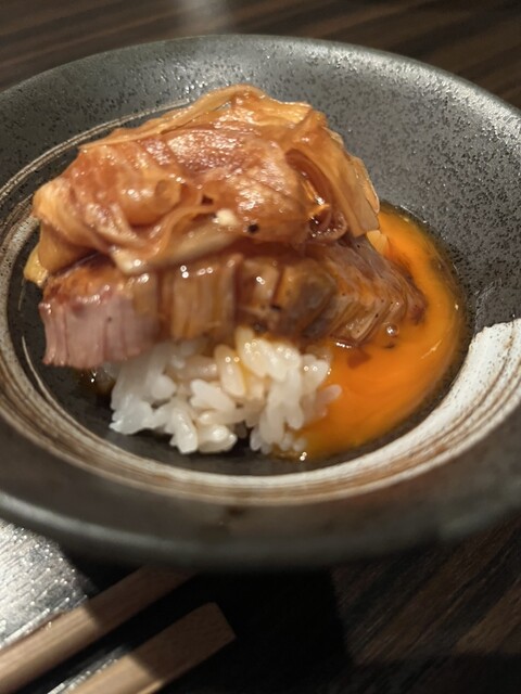 分厚いお肉にすき焼きのタレを絡めて焼くから、匂いから美味しい。一口ご飯につまめる卵と絡めて最高!