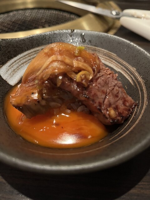 一口ご飯にお肉と卵黄をかけて