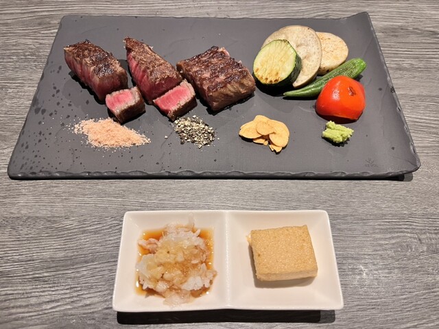 右側にある一見高野豆腐に見えるのは「泡醤油」、そのお隣は鬼おろしのポン酢かけです。お肉もお野菜も最高においしかったです。味変しながらいただきました。