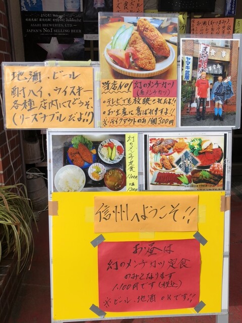 岡谷は諏訪湖のほとりの綺麗な町です。駅前のお店。日曜日のお昼に訪問しました。店内はレトロで渋い昭和の有線放送?がかかってます。ランチは馬肉メンチカツ定食のみと言うこと。それが目的なので丁度良かった。20分位で提供。馬肉の味とは?との事でまずは何もつけずに頂くと、赤身の肉の旨さがしっかりしてます。脂ではなく肉の味。牛とは違う風味ですね。美味しいです。メンチ一個が大きいので、半分位をそのまま食べて残りはソースとカラシで頂きました。馬肉メニューが他にも色々あるので試したい。ビールが飲めたらなお良い。後、定食のご飯と味噌汁、サラダなども美味しかったです。特に味噌汁を熱々で出してくれるお店は間違いがない。気がしますね。
